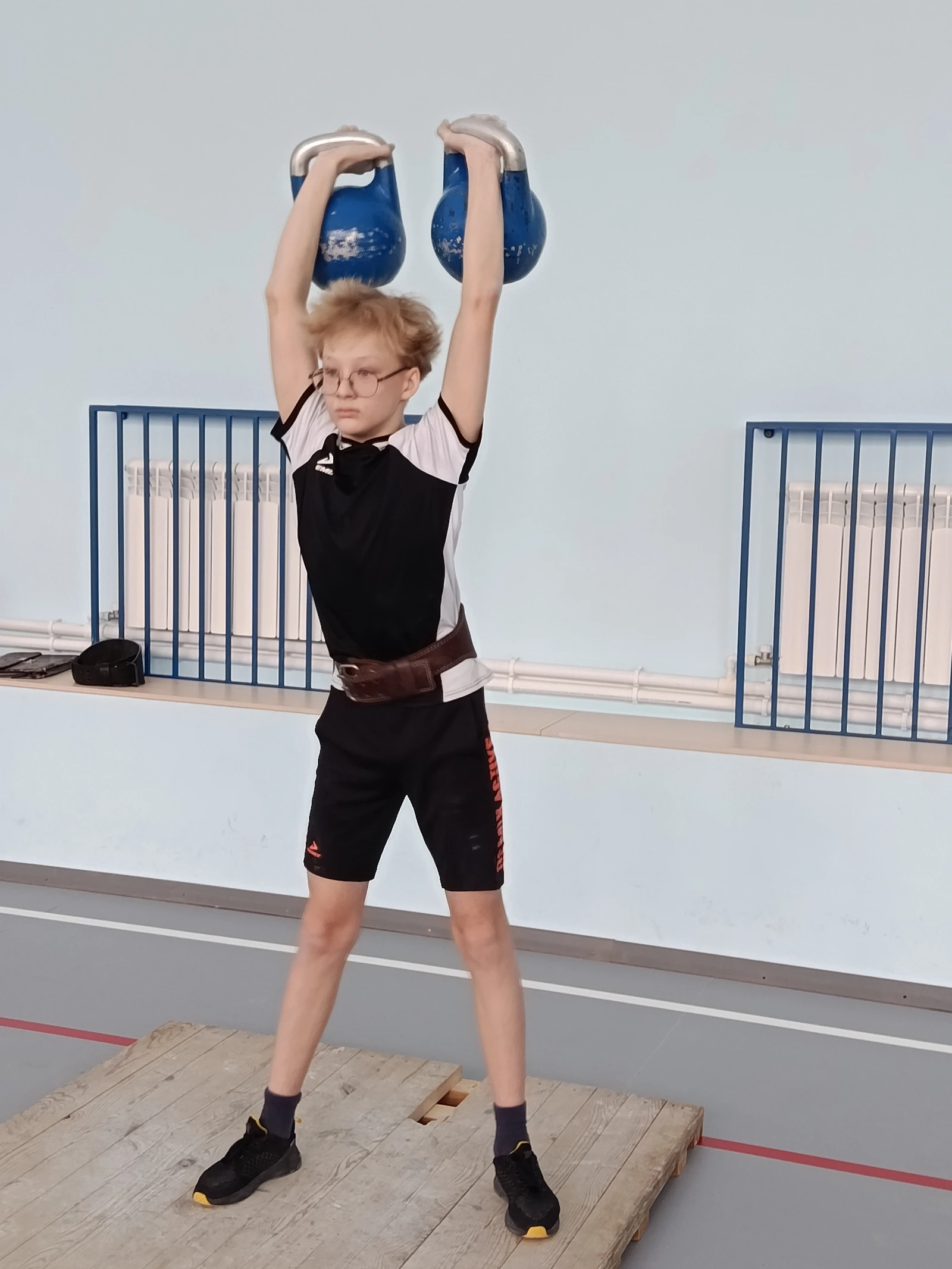 А в группе до 14 лет неоднократные призеры областных соревнований Антончик Владимир, Былков Владислав и Макаров Леонид, толкнувший гири 12 кг 94 раза и показавший самую высокую сумму двоеборья 160 очков, и здесь разделили комплект медалей. Получивший приз за волю к победе Уруппа Савелий на следующий день принял участие в соревнованиях по пауэрлифтингу и выиграл серебряную медаль!